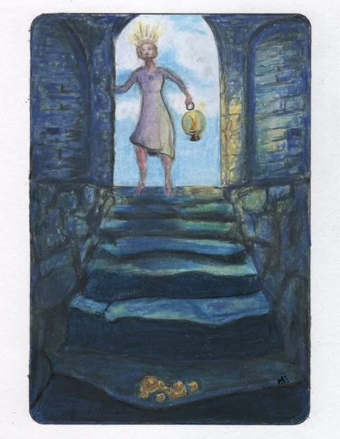 In the weeks following the transmission, I will set aside sacred time and space to ritually work the vision and sigil into a painted or drawn piece of art work. Because the entire process is intuitive, the medium I use and the size may vary, though I always draw within a tracing of one of my tarot or oracle cards, so about a 5 inch diameter circle or 3.75x 5 inch rectangle on a slightly larger piece of paper.  Sometimes, I focus on pencil, other times it’s watercolor.  Once the piece is complete, it will be stabilized with cardboard, sleeved in plastic and sent via USPS Priority mail.